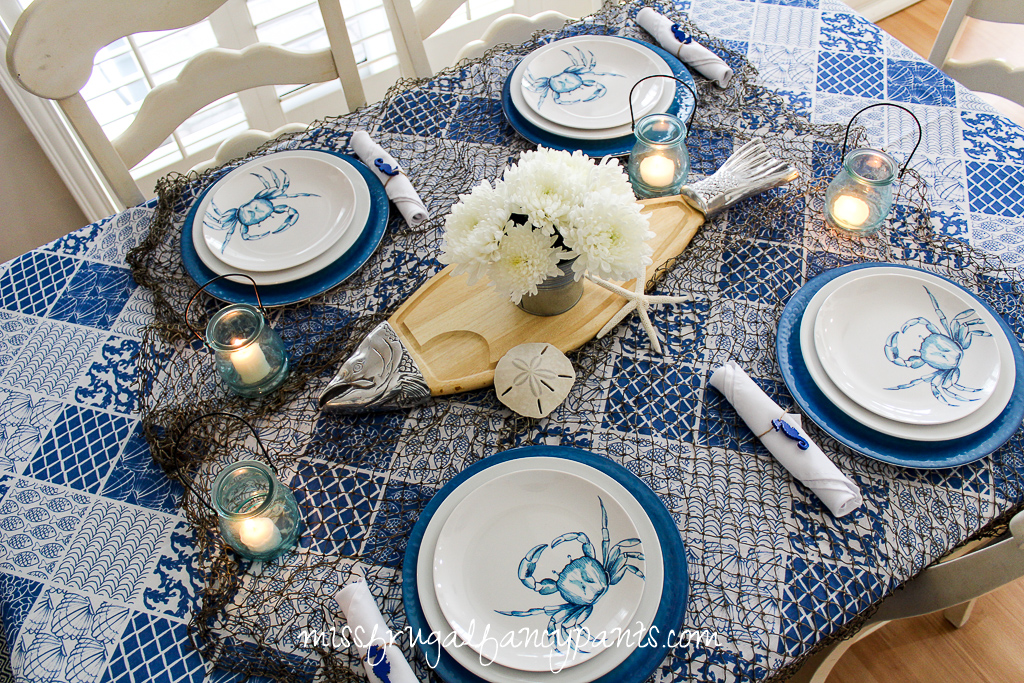 In case you’ve missed it, I’m a little obsessive when it comes to coastal decor. I get all sorts of giddy when I see my kind of coastal stuff, as evidenced by my favorite Pinterest board, Mostly Coastal for the Home. Sadly, most of the items that make me gaga are way out of our budget. Shocker. One of the out of budget items I pinned ages ago has had me wanting to create a coastal tablescape with wannabe plates. It just so happens I got super lucky and found similar plates at HomeGoods and decided this was the perfect opportunity to create a blue and white coastal tablescape for Father’s Day. I found them right around the time Wayfair asked me to participate in a blogger Q&A on tablescapes. #tablescapesonmymind